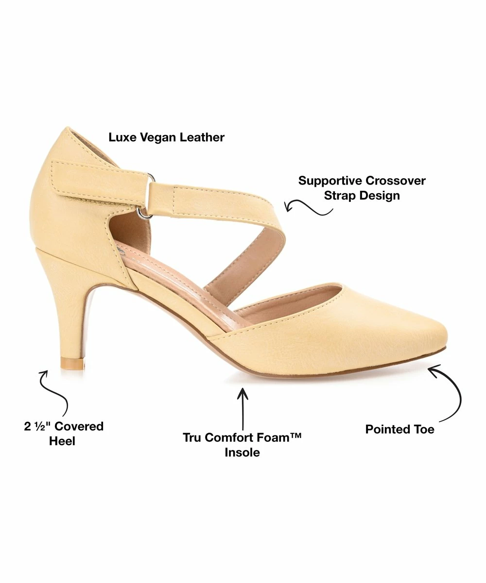 Complete your look with these pointed-toe pumps featuring a crossed strap and cushioned insoles. Vegan leather construction.