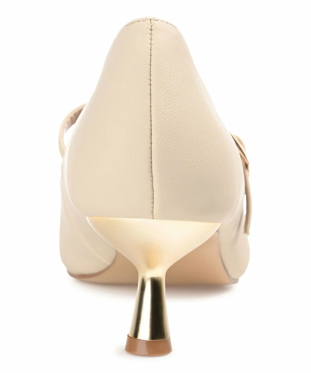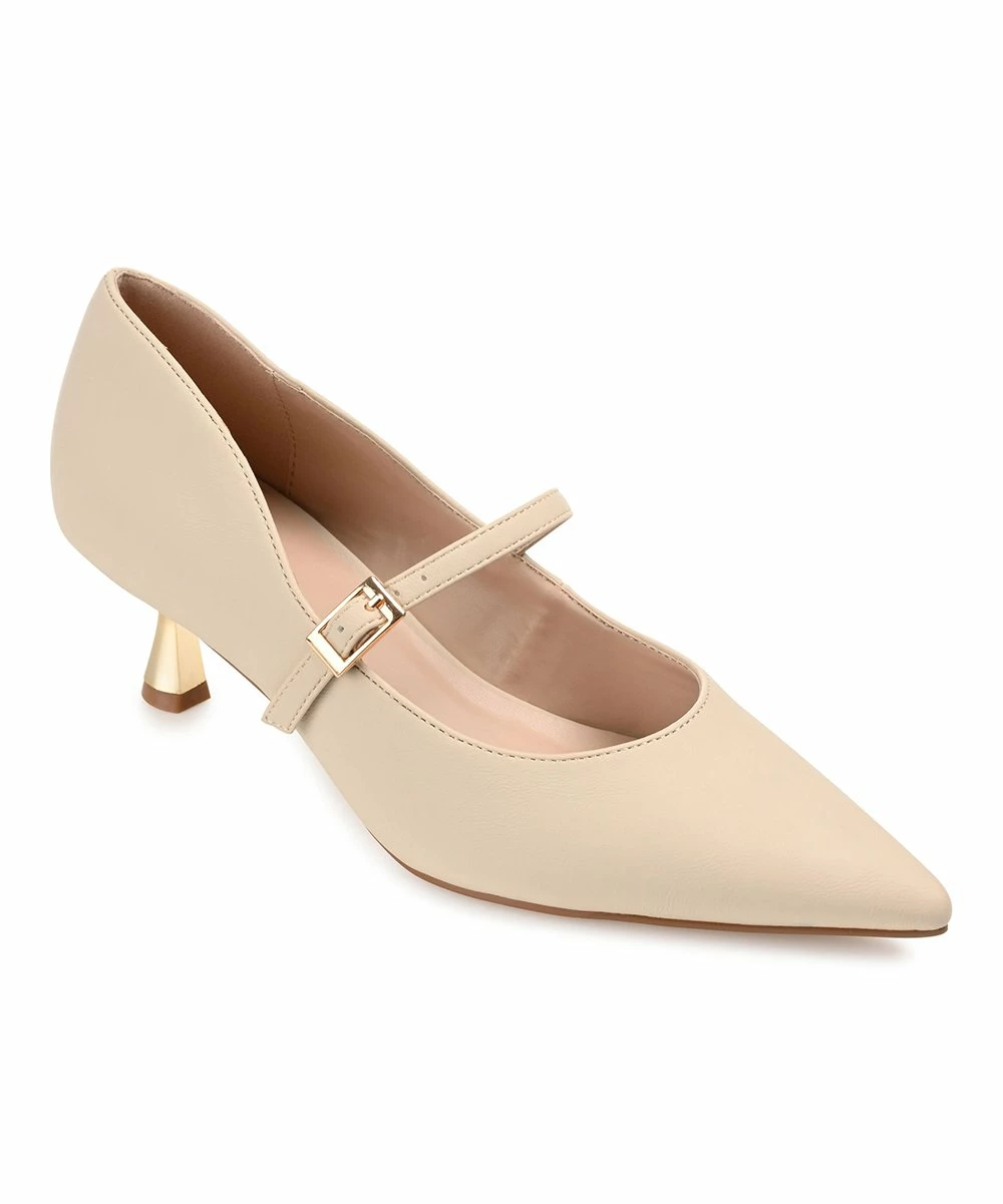 This pointed-toe pump features a chic kitten heel and a stylish buckle-strap design.