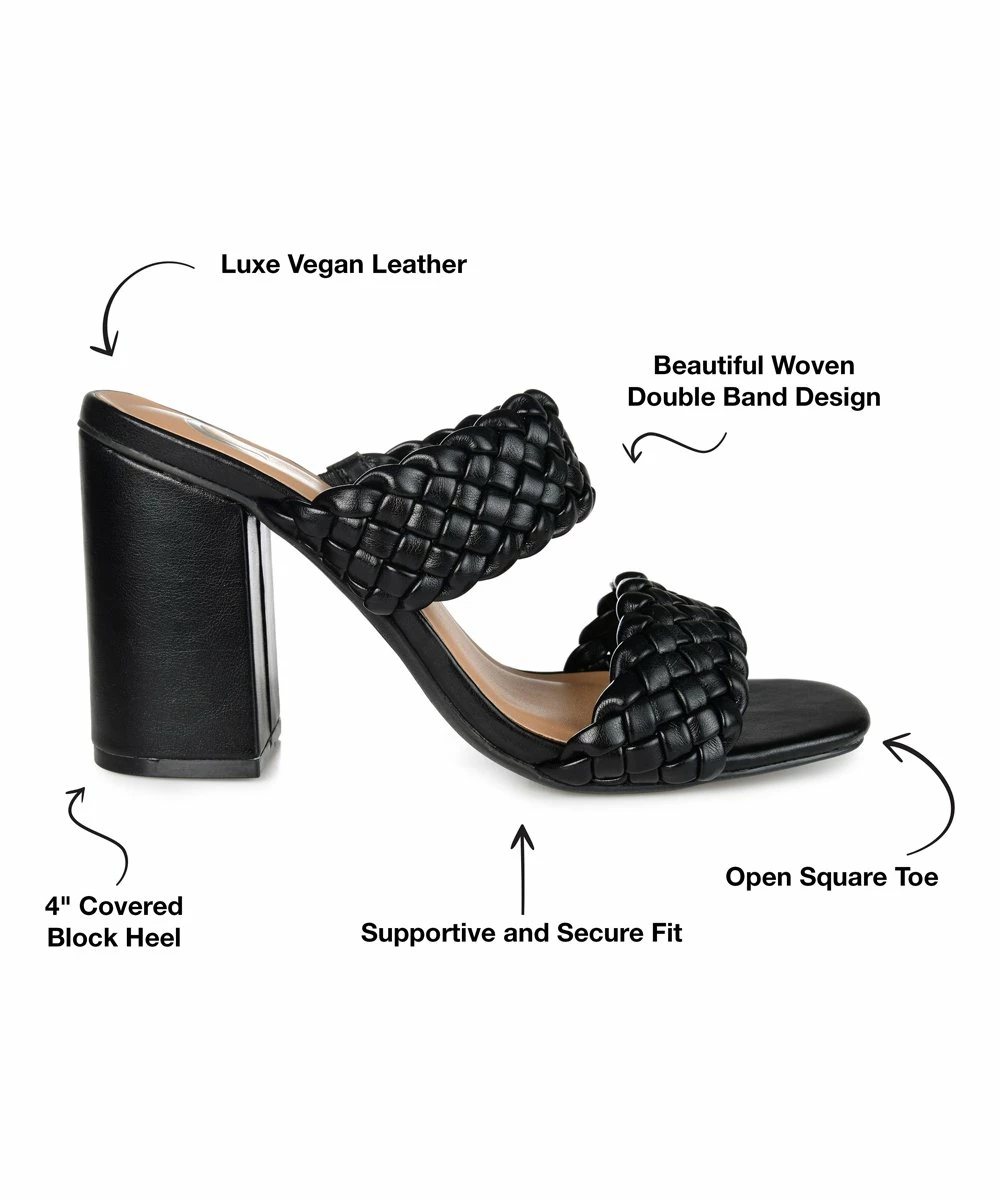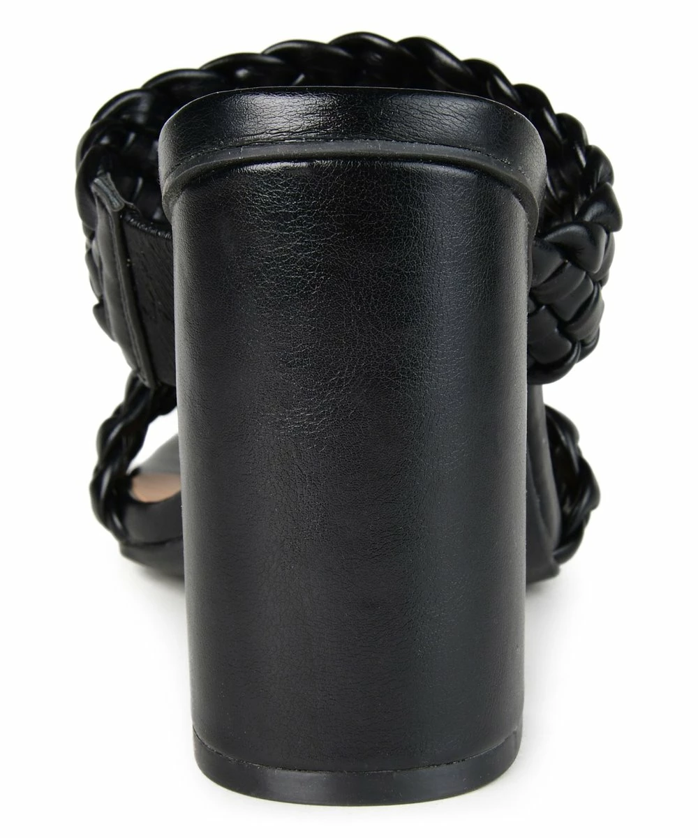 A pair of sandals featuring a chunky heel and braided straps. Vegan leather construction.