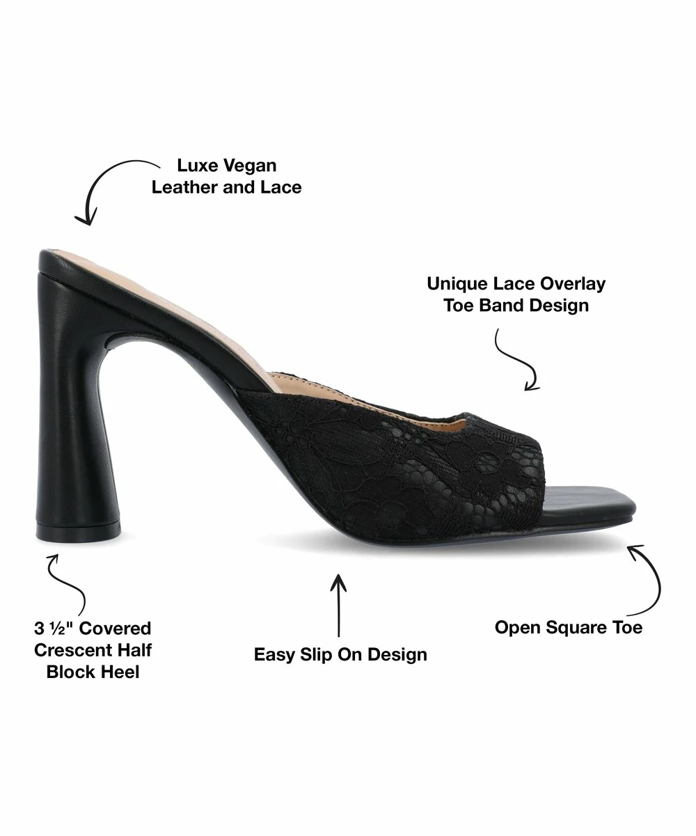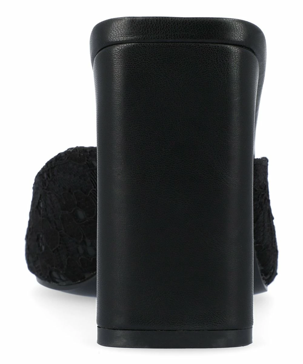 A floral lace overlay dresses up these high-heeled slides, which also offer a square toe and a padded insole.