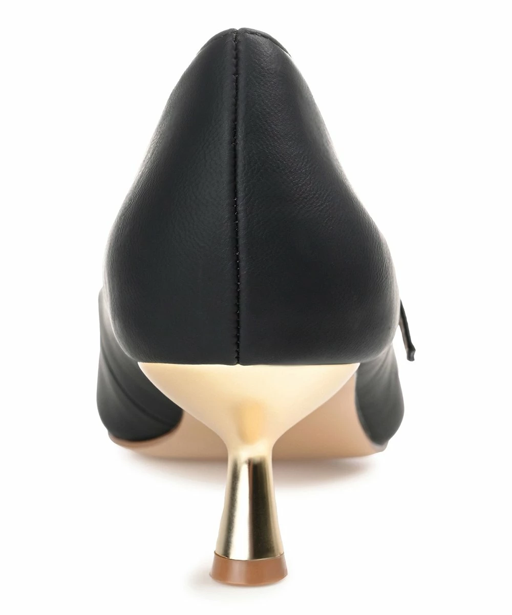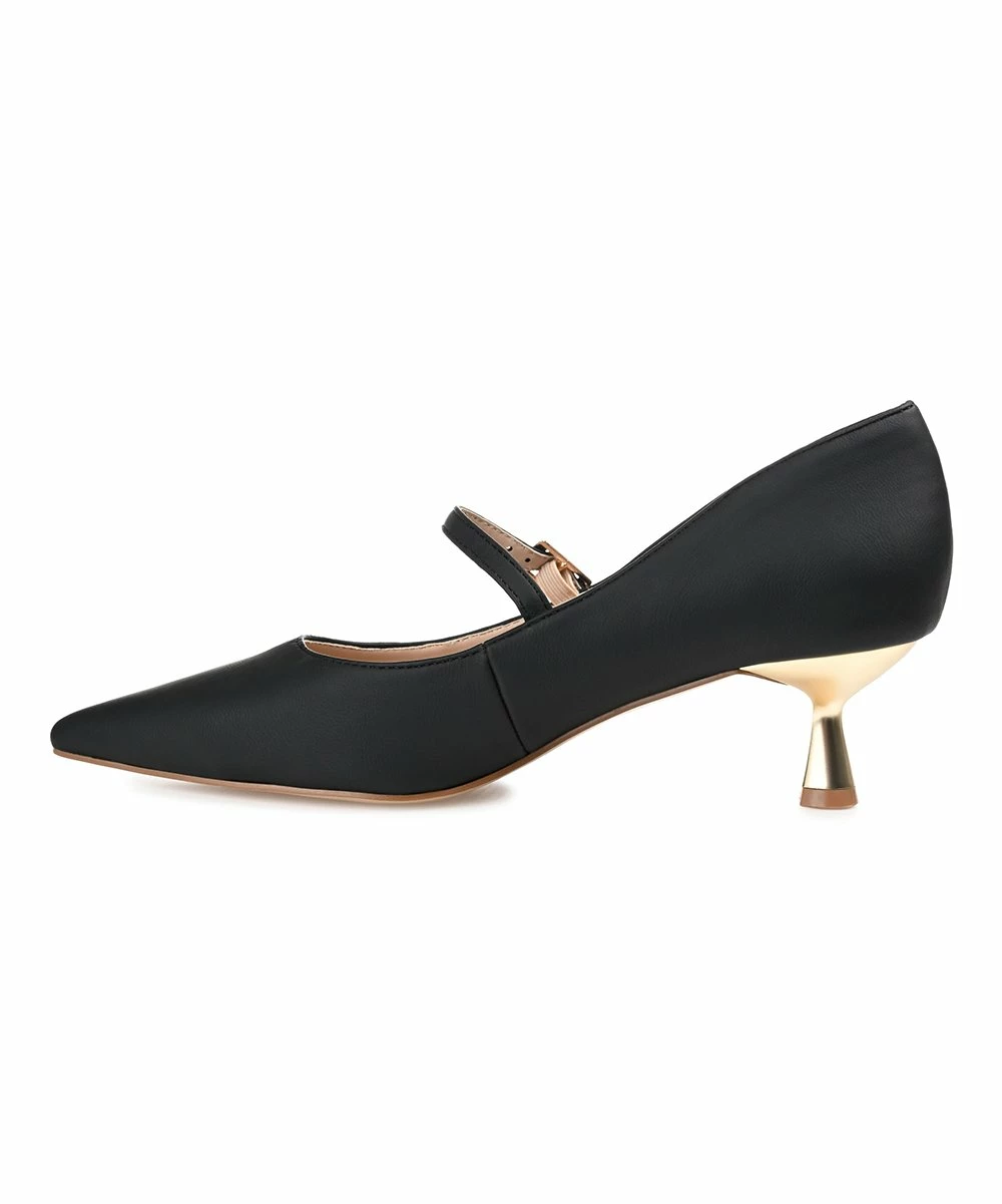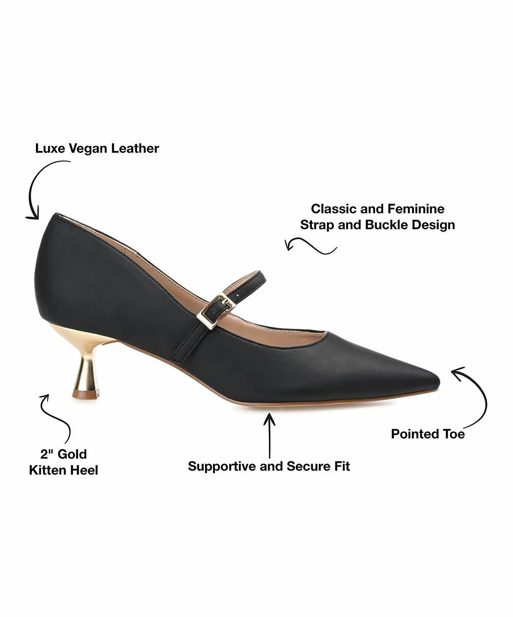 This pointed-toe pump features a chic kitten heel and a stylish buckle-strap design.