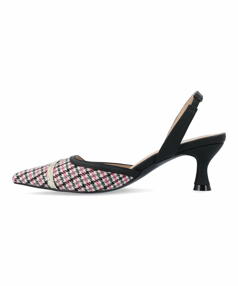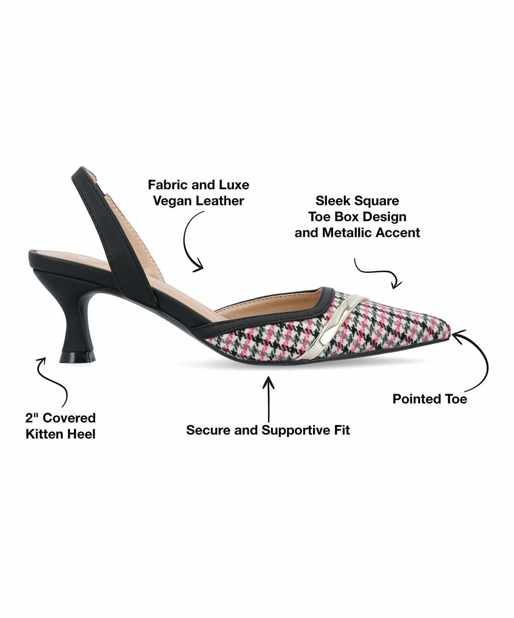 Kitten heel pump with a timeless houndstooth pattern and a stretchable slingback strap for secure strides.