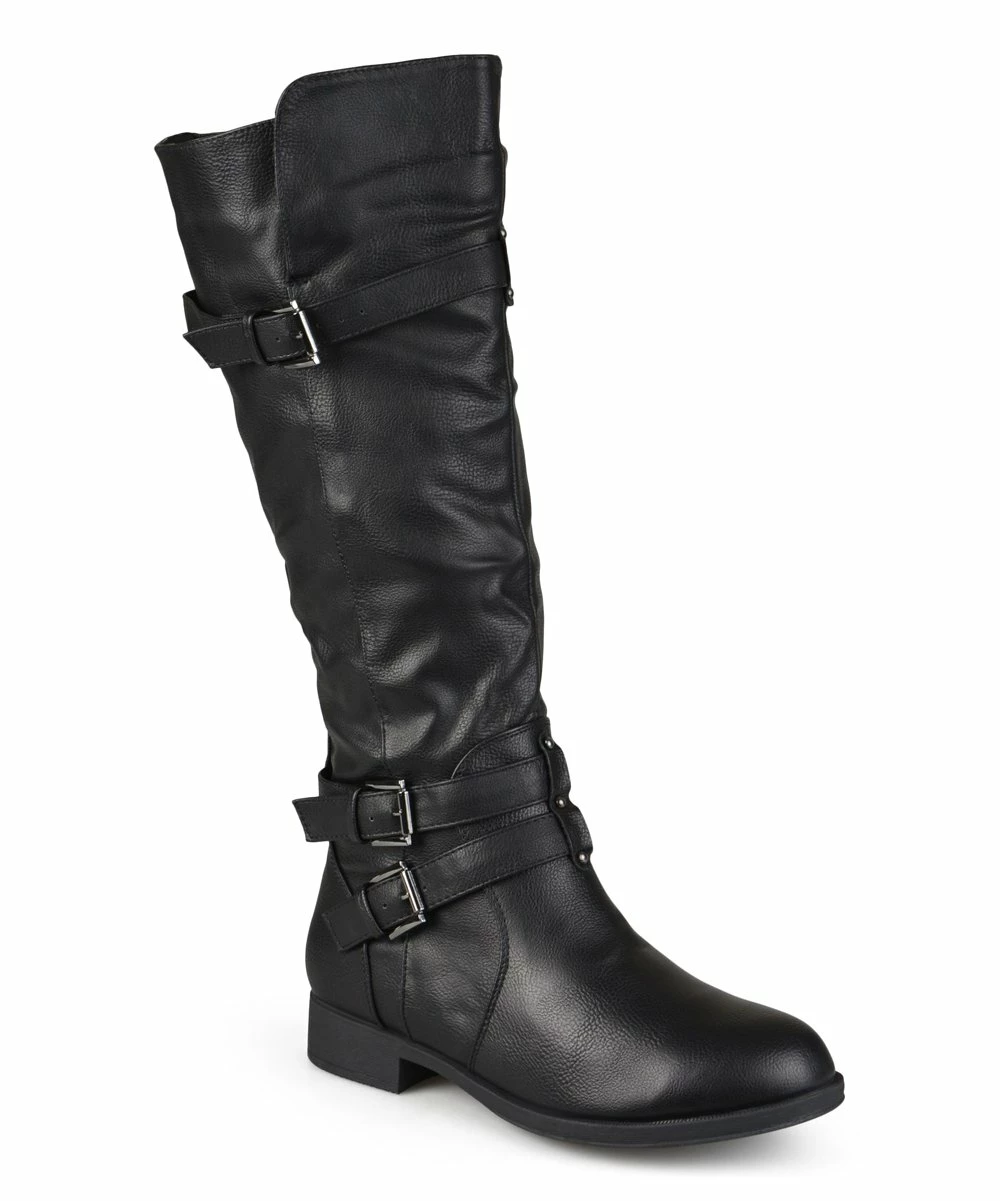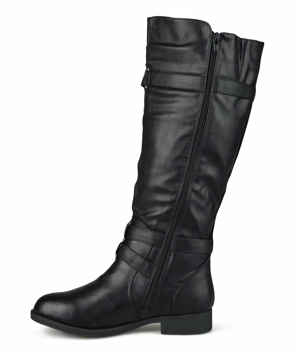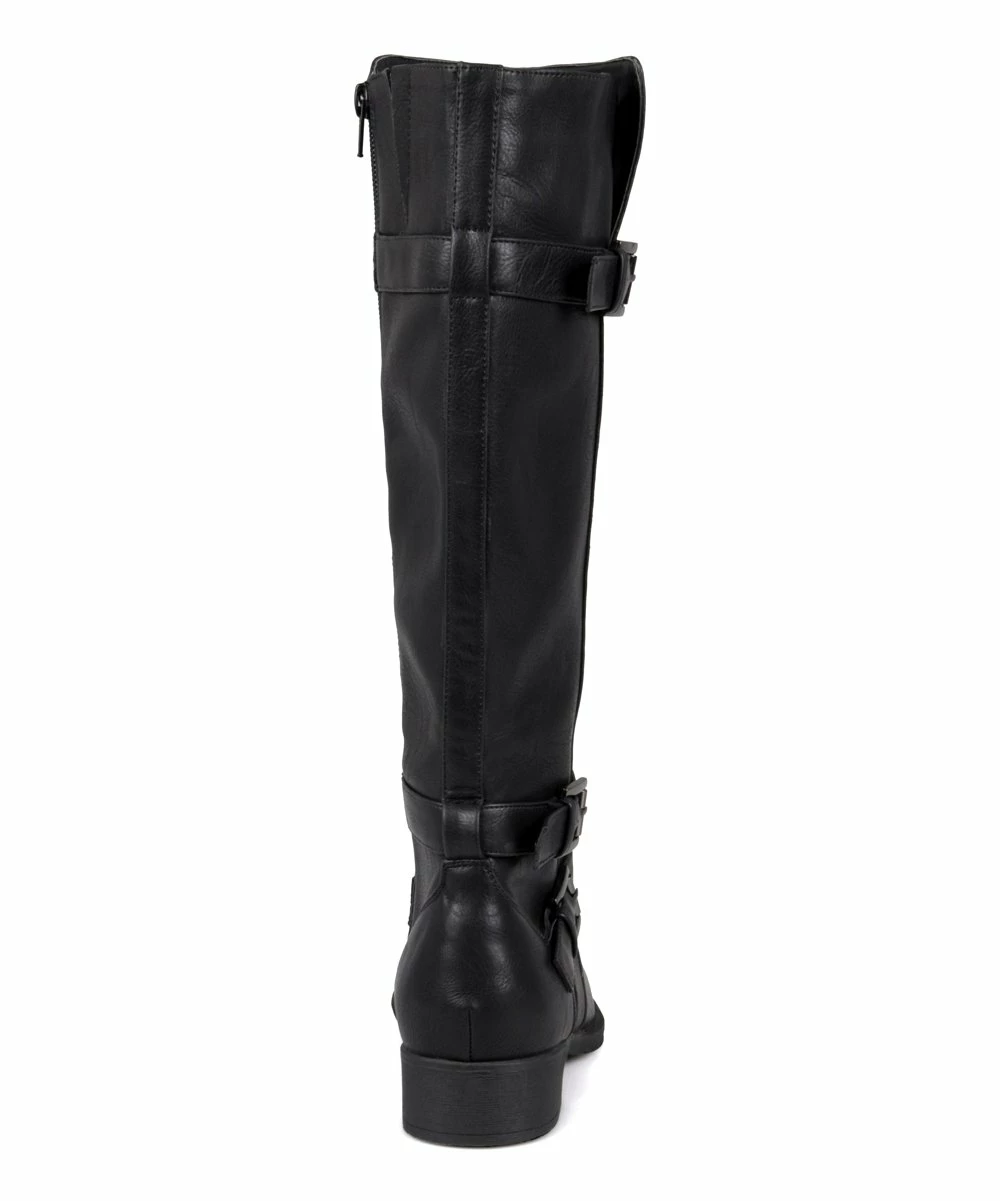 Knee-high boots with buckled accents and a zip closure at the inner ankle.