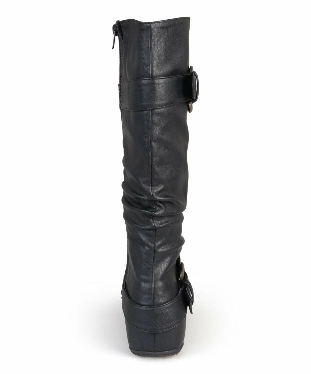 These slouchy boots feature a knee-high silhouette embellished with wide straps and shiny buckles.