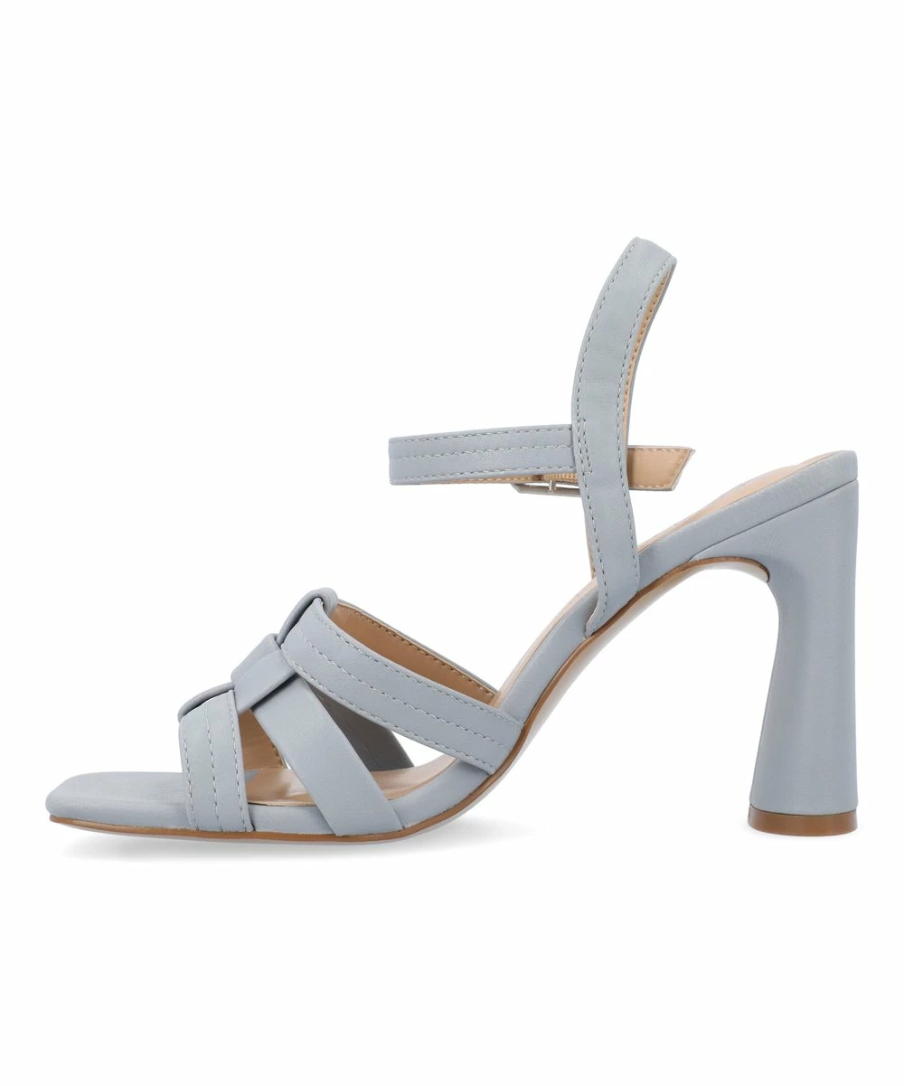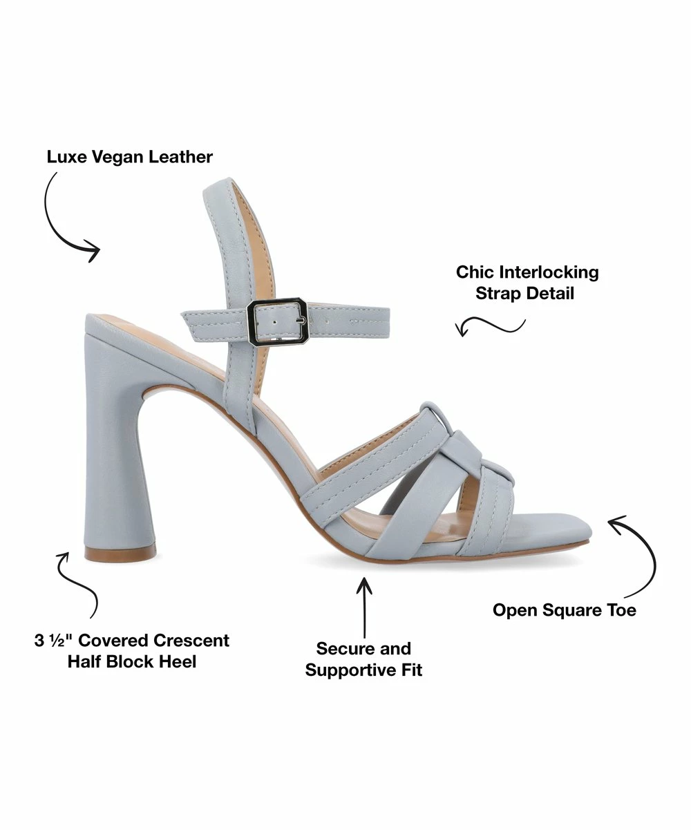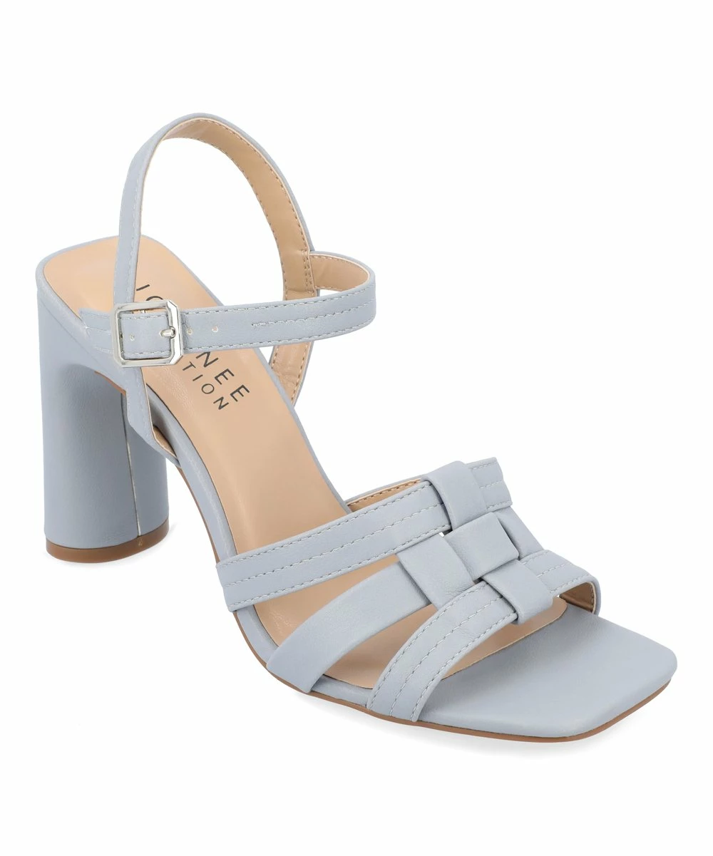Block-heel sandal features a square toe, a padded insole and a buckle at the ankle. Woven straps create an intricate design.
