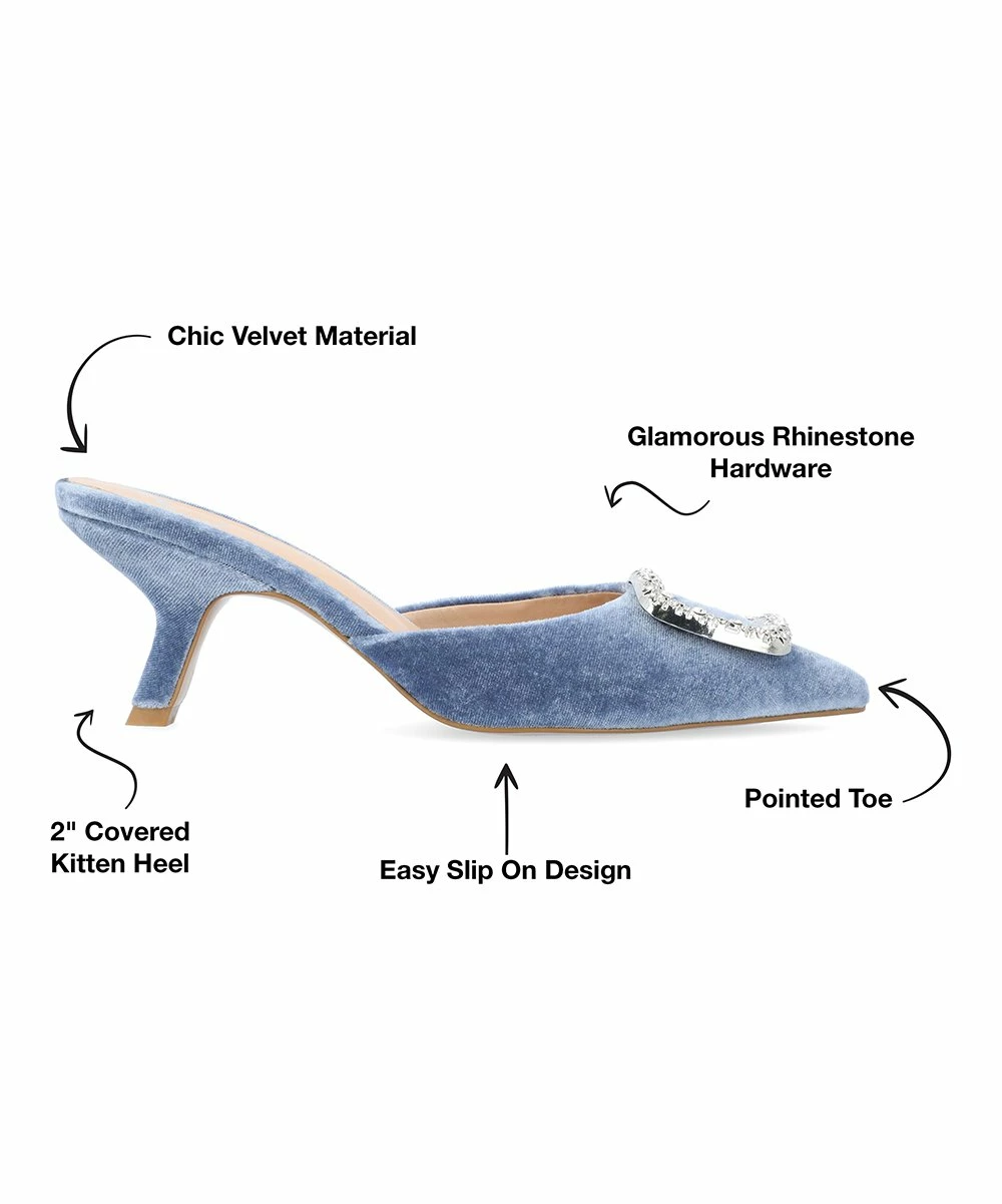 This kitten heel pump features soft velvet material and a shimmering buckle-accent design.
