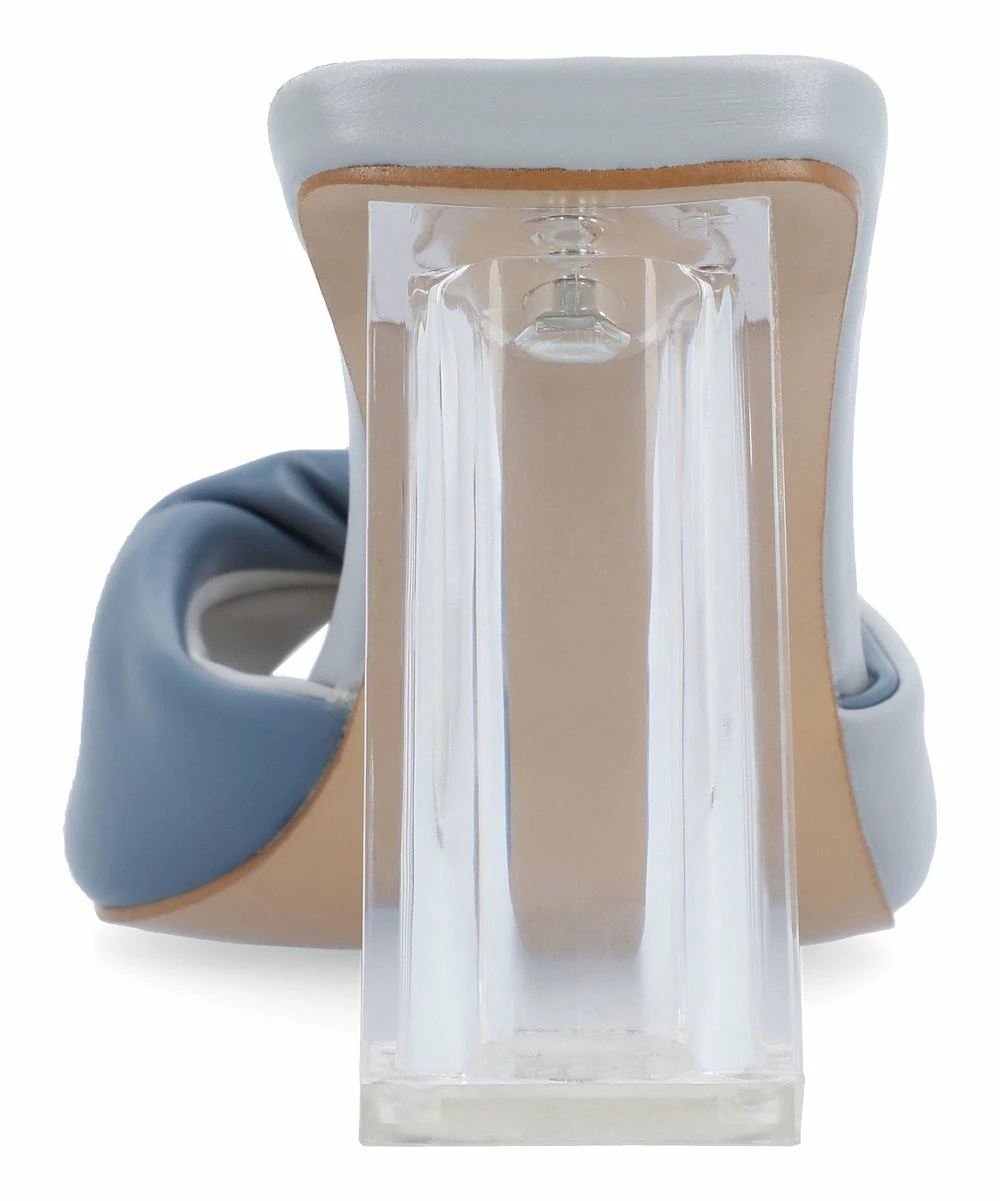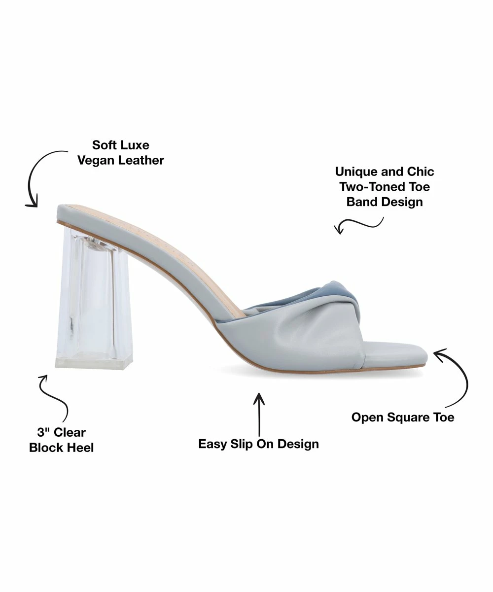 These block-heeled slides feature square toes, padded insoles and a stylish twisted band that shows off two colors.