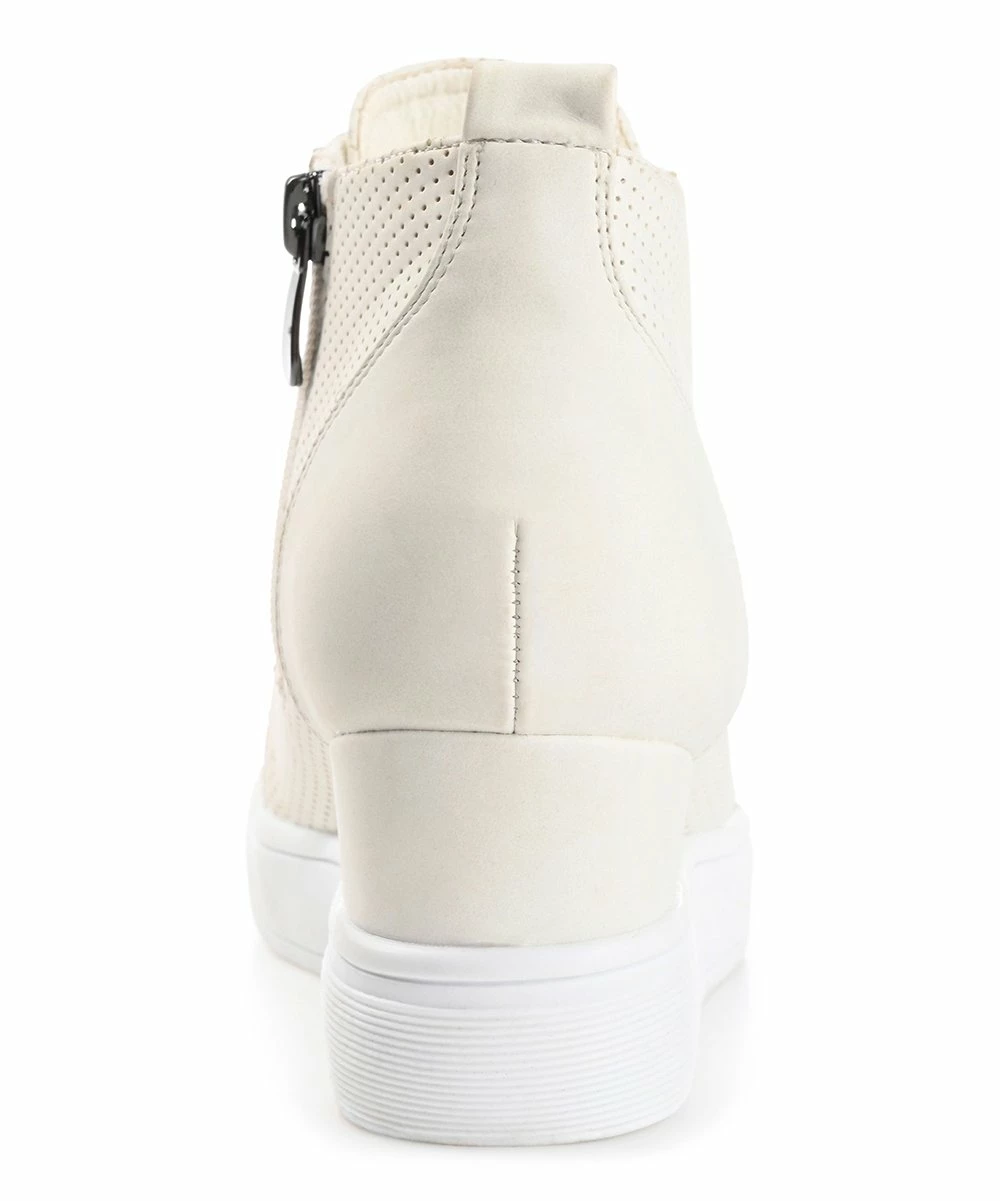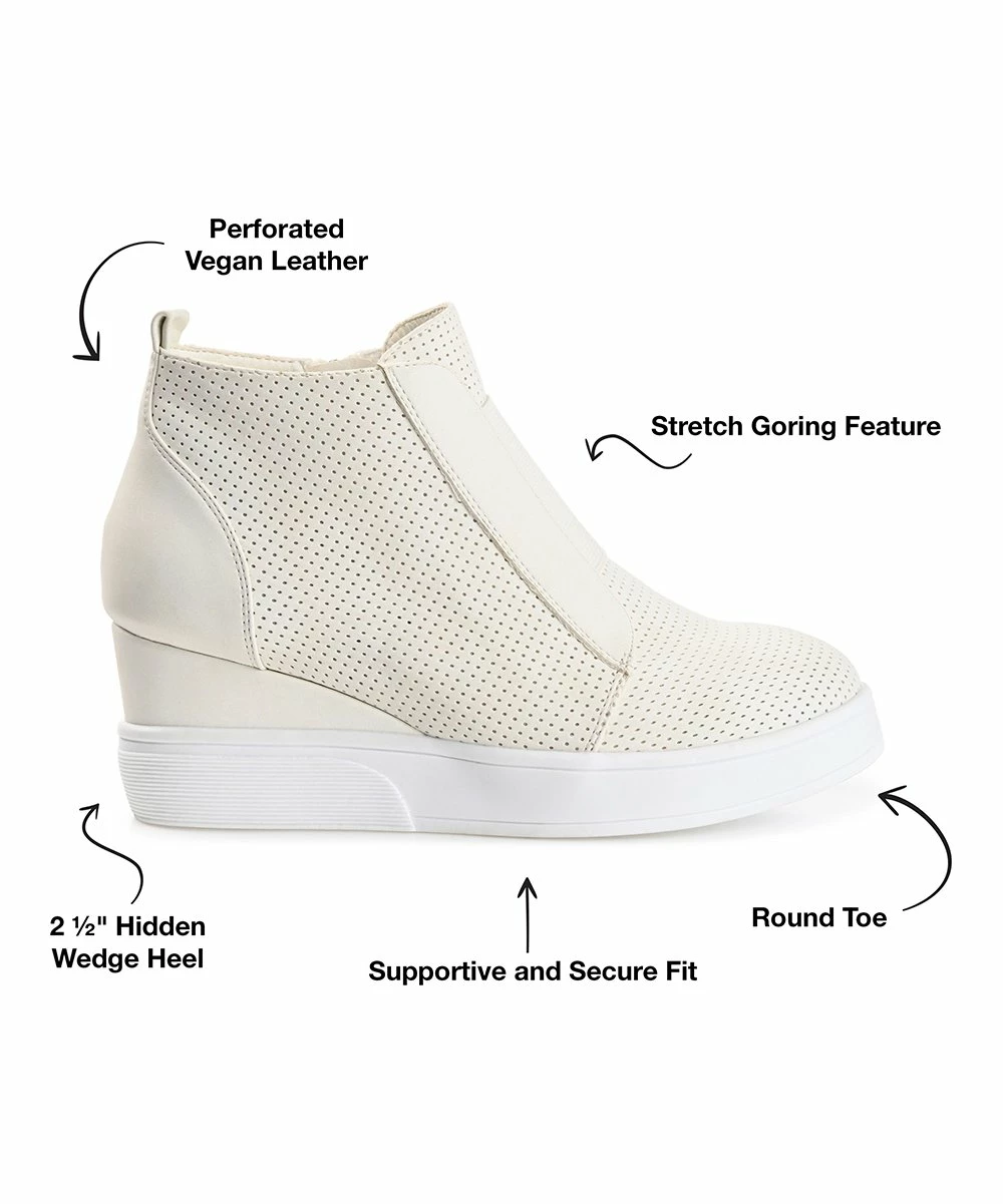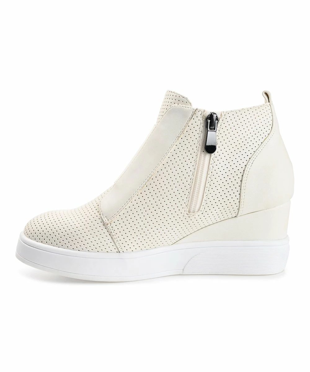 A pair of wedged sneakers featuring a pinhole texture and a vegan leather construction.