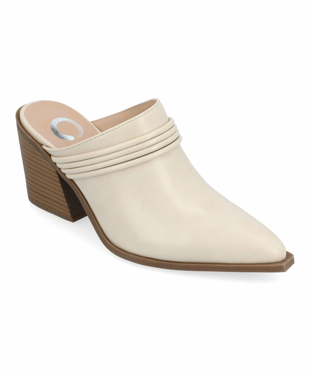 A pair of pointed-toe mules featuring a chunky heel and vegan-leather construction.