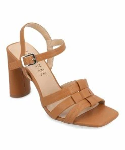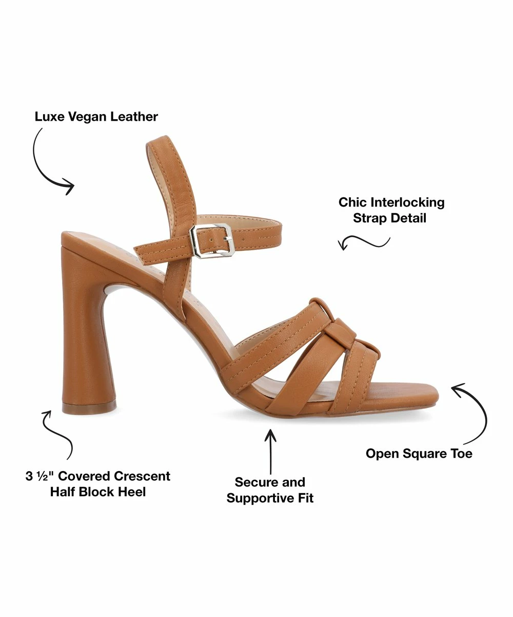 Block-heel sandal features a square toe, a padded insole and a buckle at the ankle. Woven straps create an intricate design.