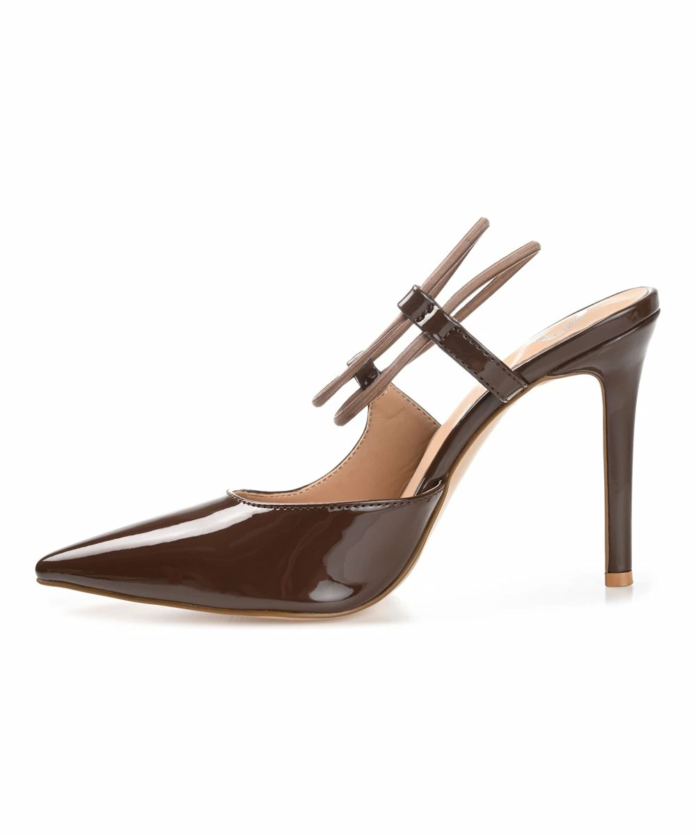 A strappy, pointed-toe pump made from vegan leather.