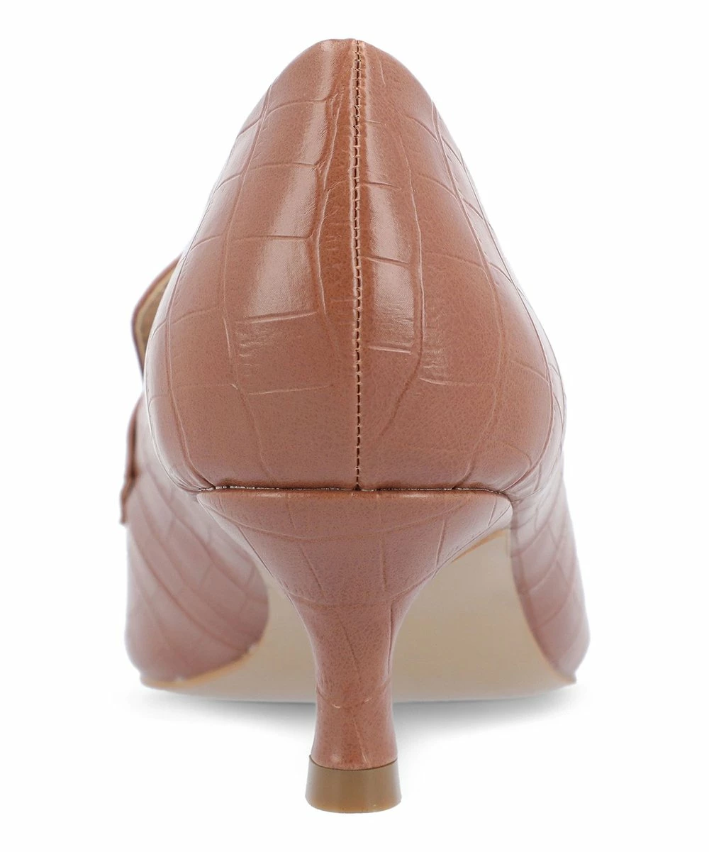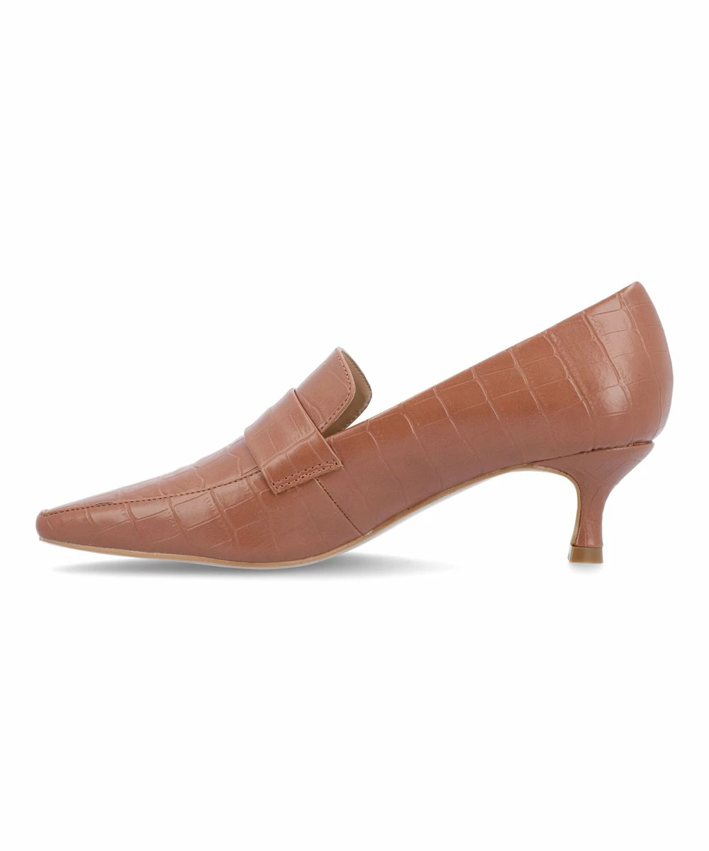 A loafer-inspired pump featuring a kitten heel and a vegan leather construction.