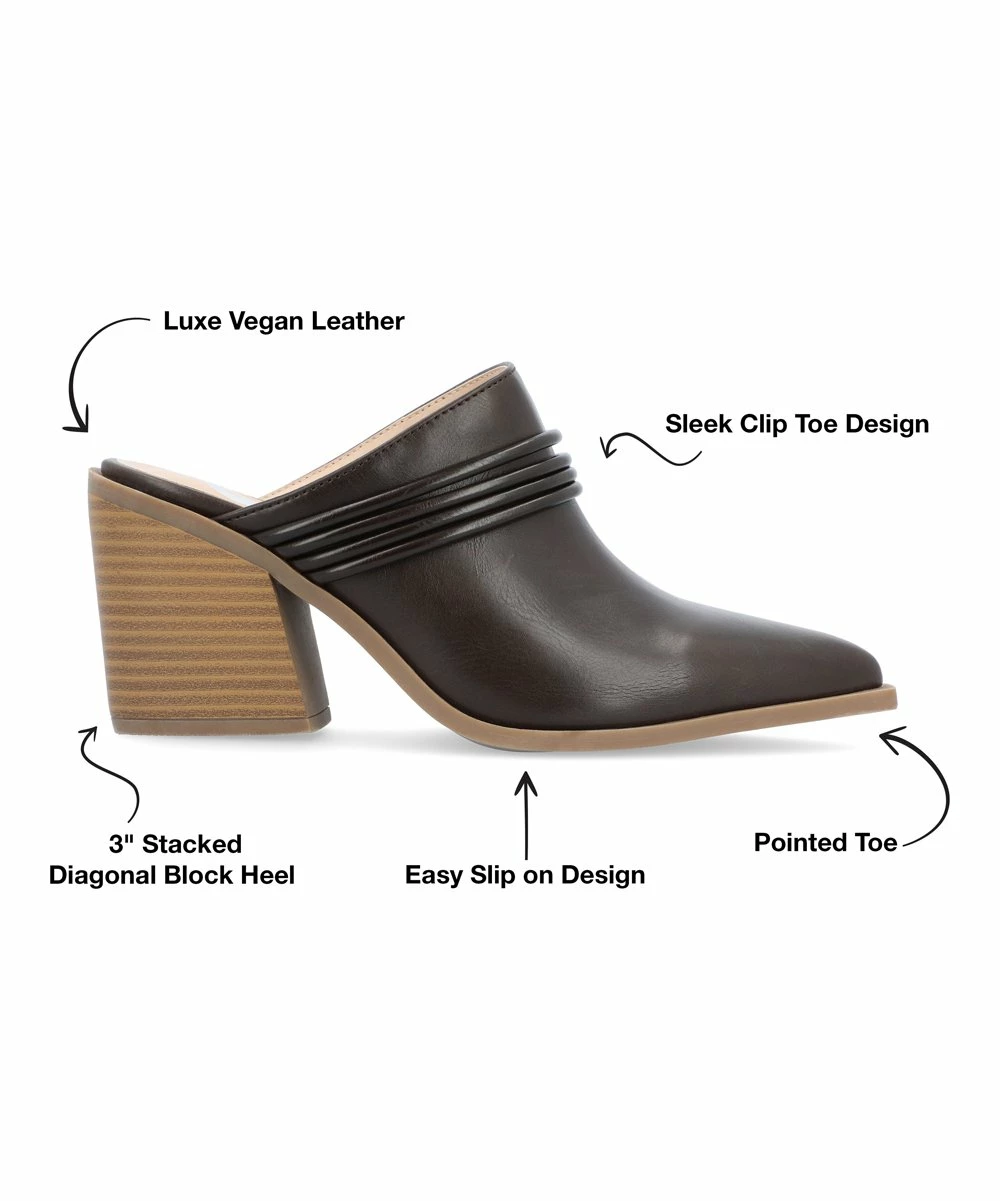 A pair of pointed-toe mules featuring a chunky heel and vegan-leather construction.