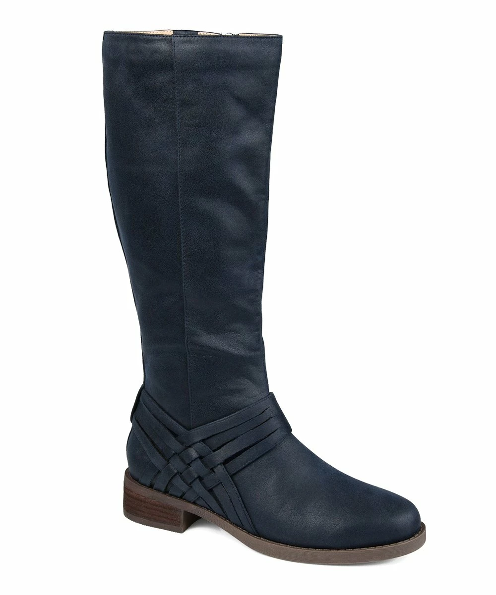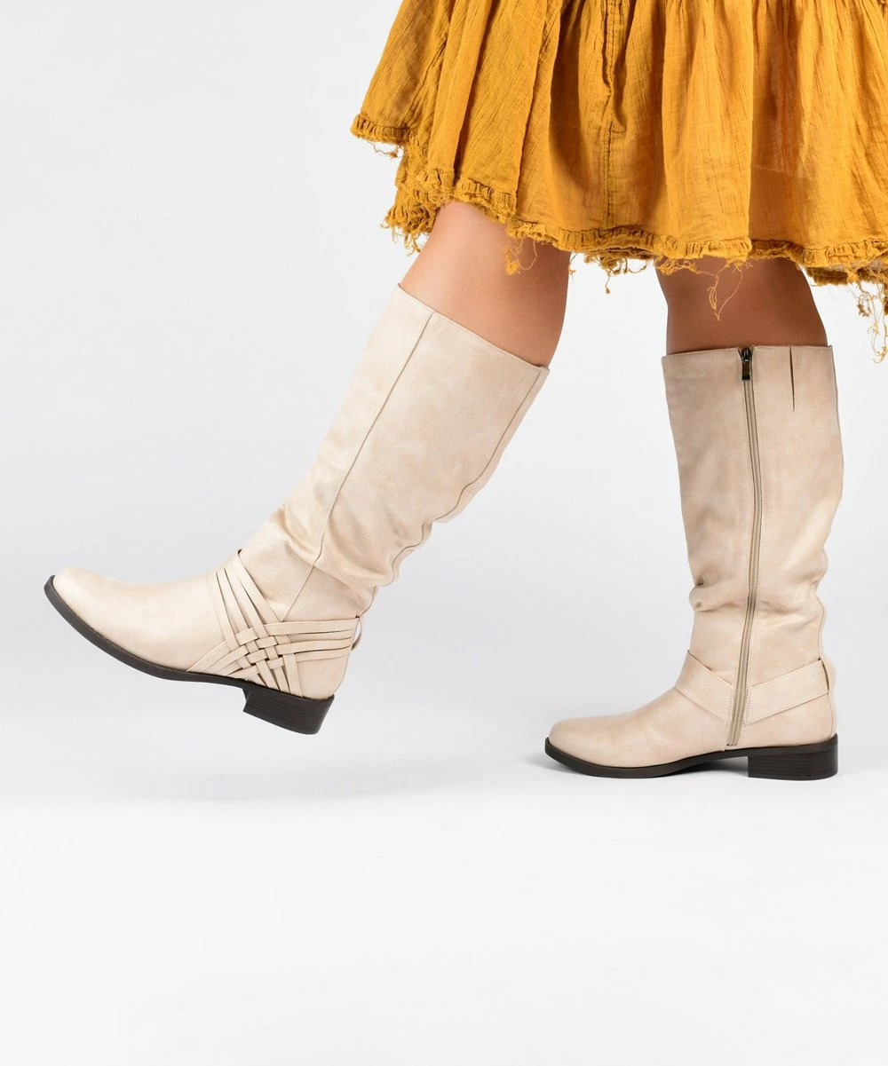These round-toe faux suede boots feature a knee-high silhouette modernized by woven crisscross details near the ankle. Finished with a comfy wide calf.