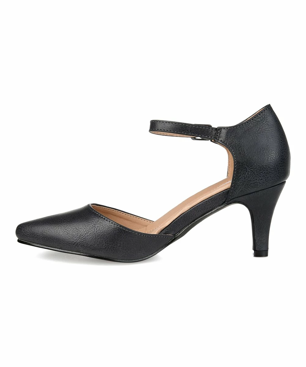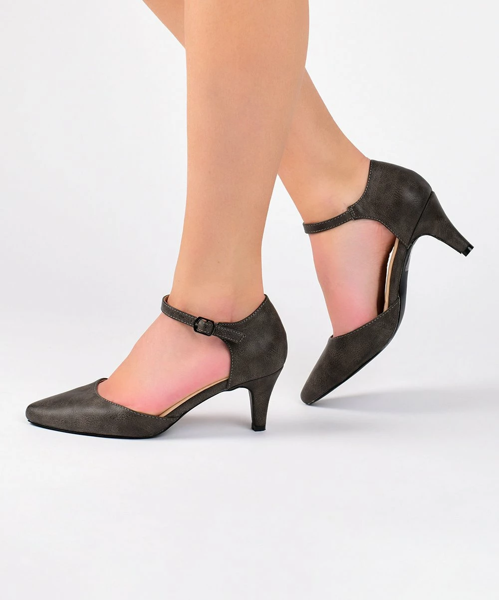 A pair of d’Orsay pumps featuring an almond toe and a cushioned insole. Vegan leather.