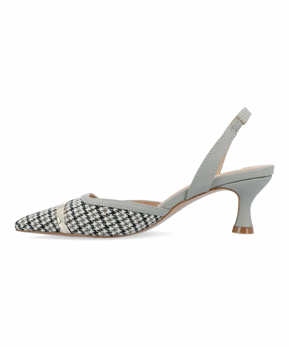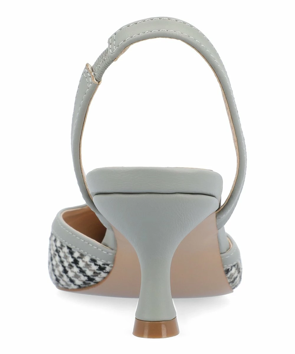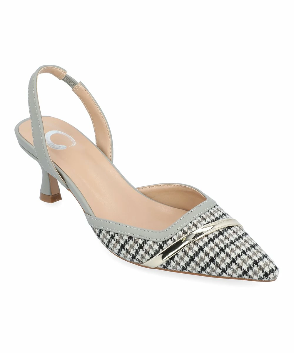 Kitten heel pump with a timeless houndstooth pattern and a stretchable slingback strap for secure strides.