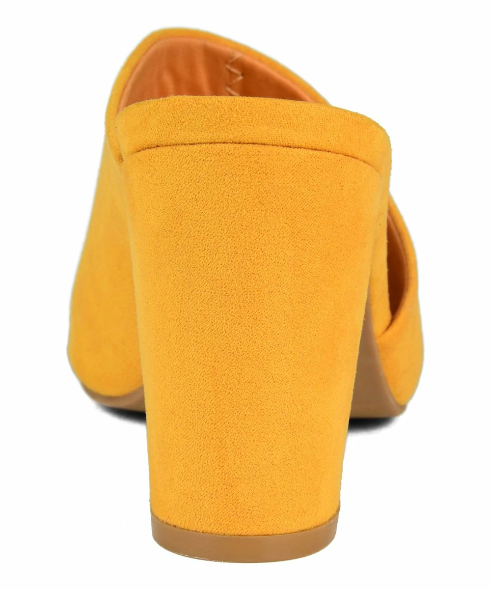 Slip into style with this pair of open-toe mules featuring a chunky heel and a D’Orsay-style vamp. Faux suede.