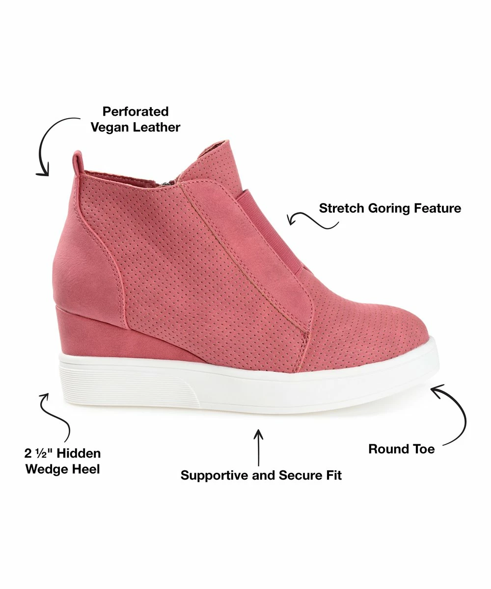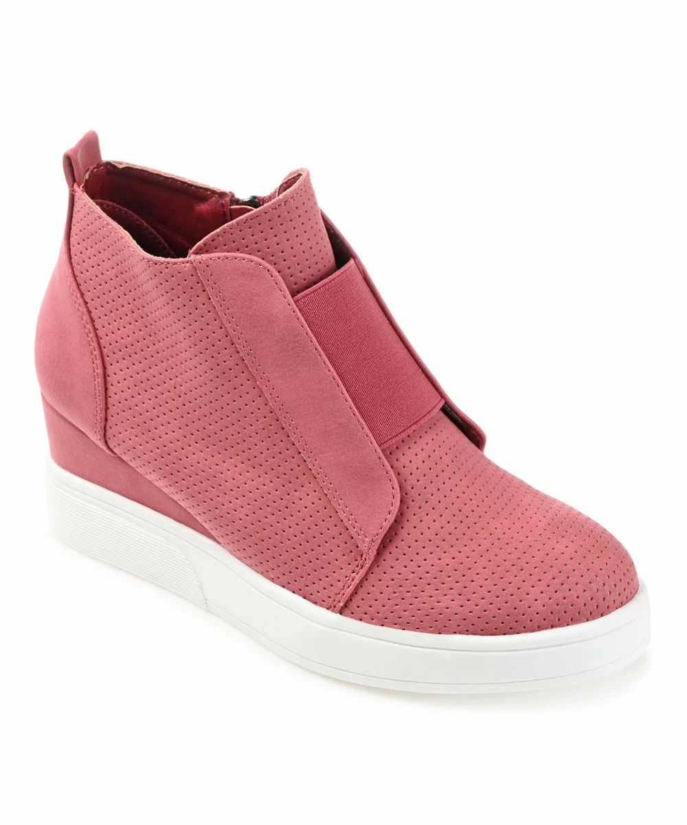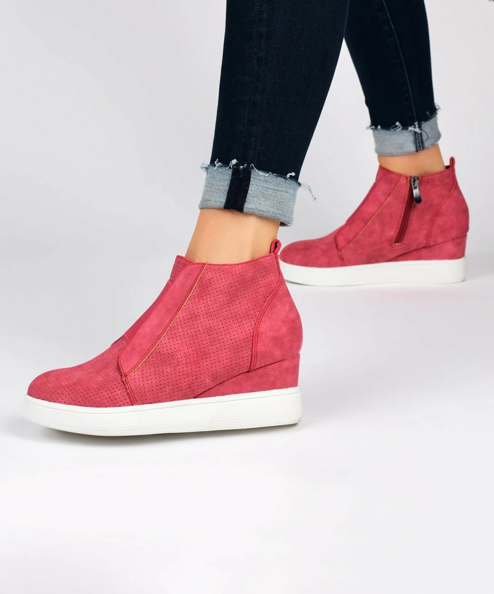 A pair of wedged sneakers featuring a pinhole texture and a vegan leather construction.