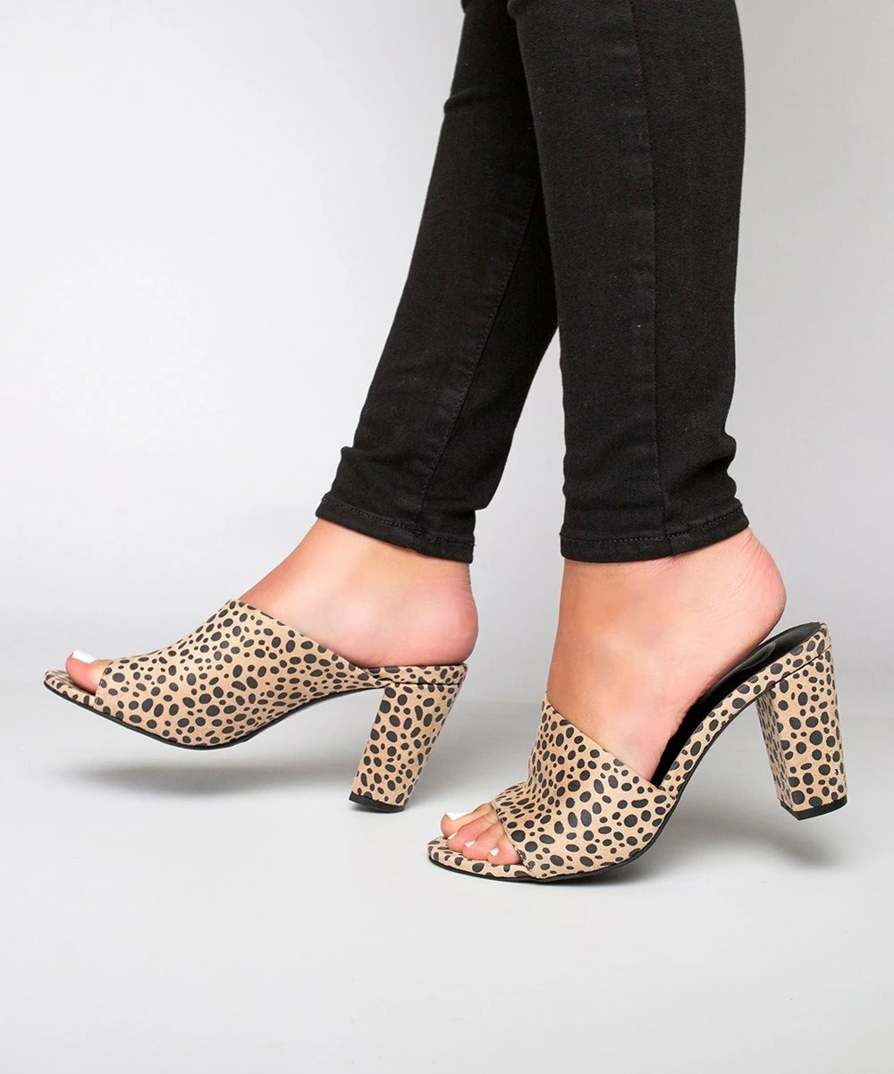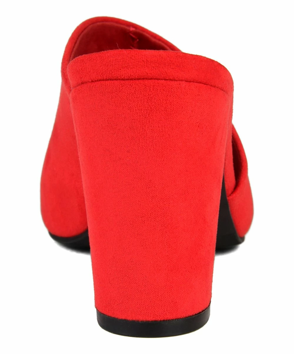 Slip into style with this pair of open-toe mules featuring a chunky heel and a D’Orsay-style vamp. Faux suede.