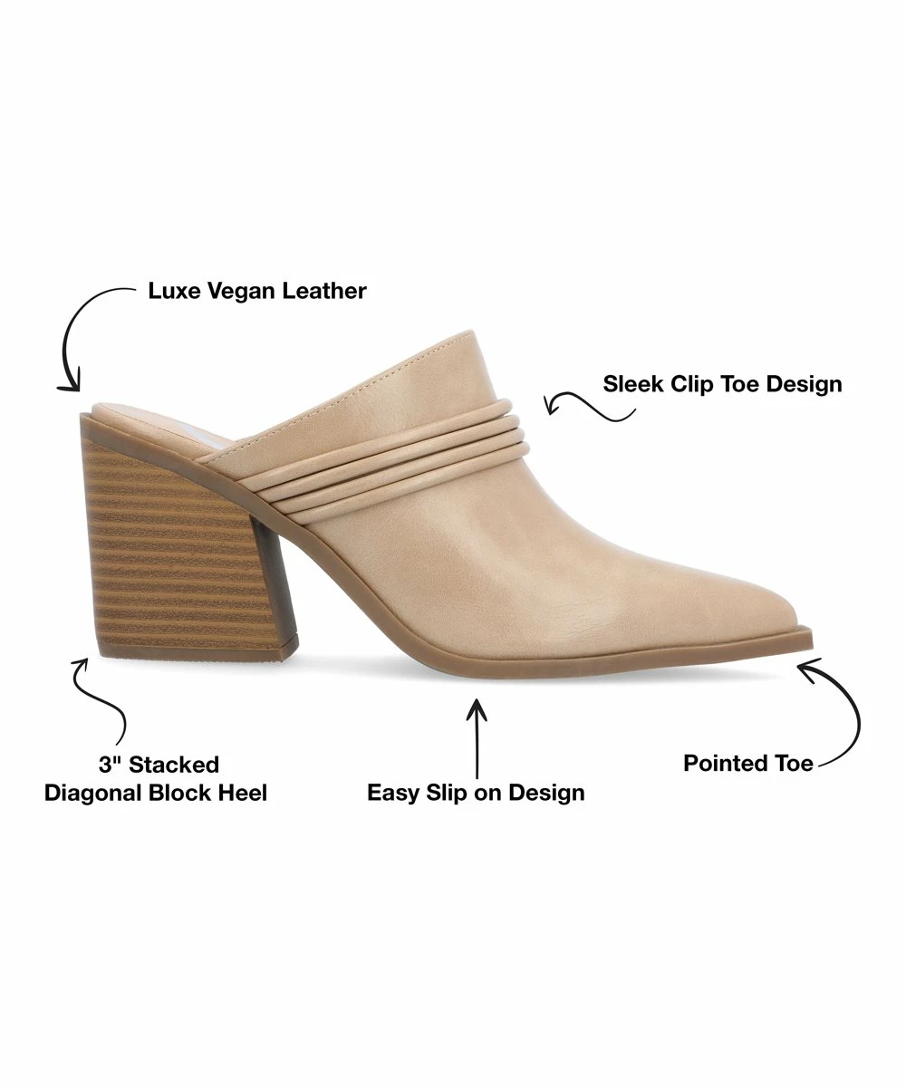 A pair of pointed-toe mules featuring a chunky heel and vegan-leather construction.