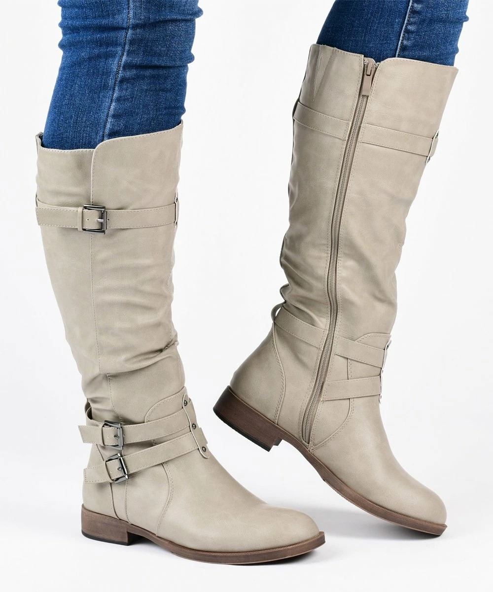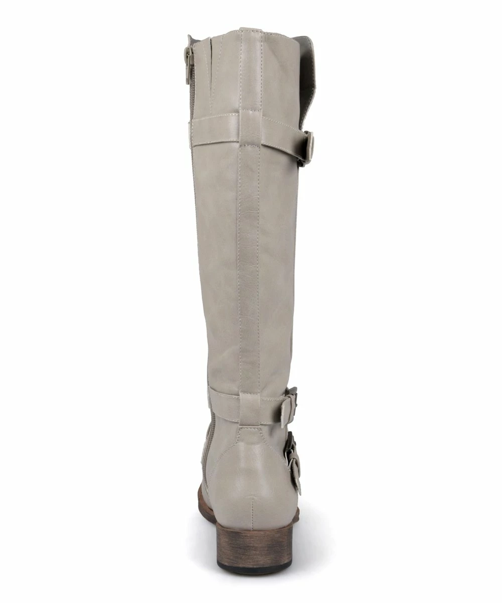 Knee-high boots with buckled accents and a zip closure at the inner ankle.