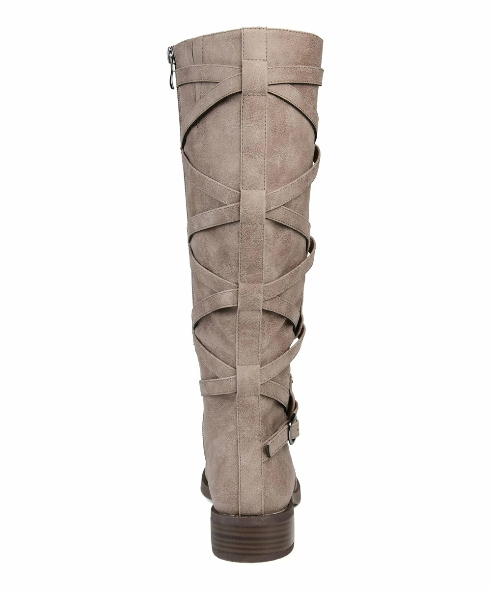 Knee-high boots with a zig-zag lace-up strap in the back and a zip closure at the inner ankle.