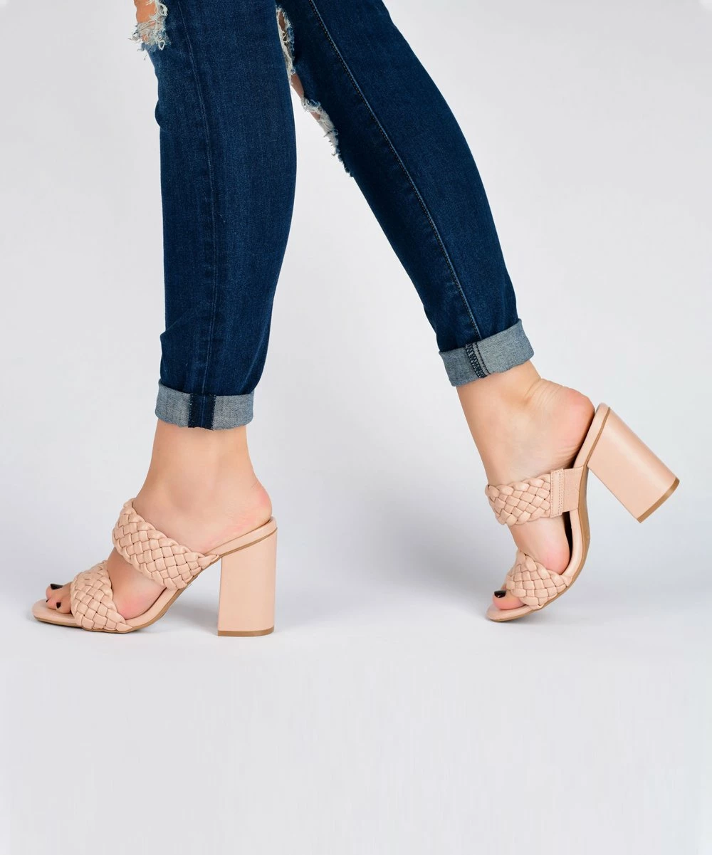 A pair of sandals featuring a chunky heel and braided straps. Vegan leather construction.