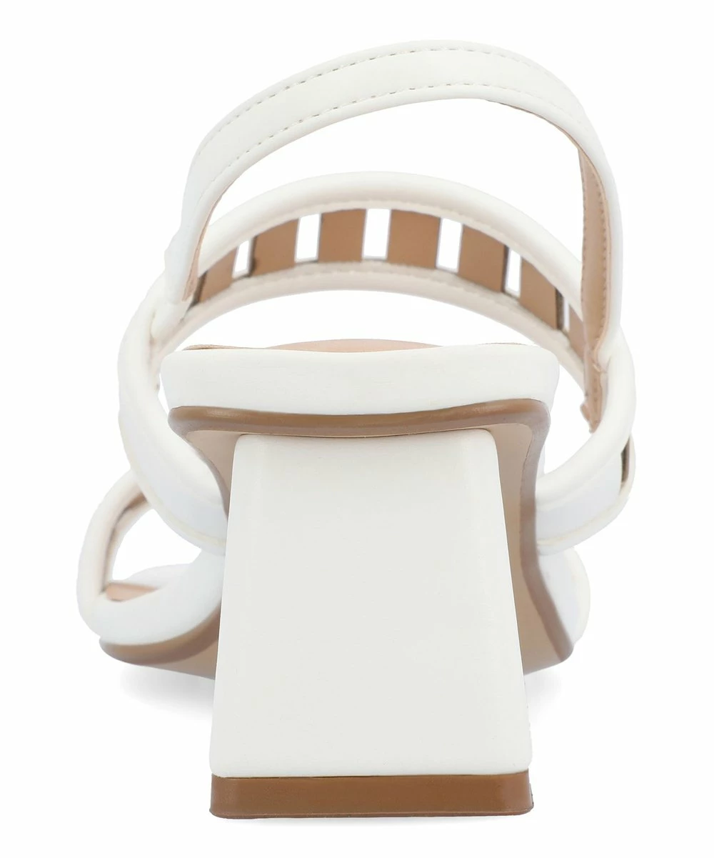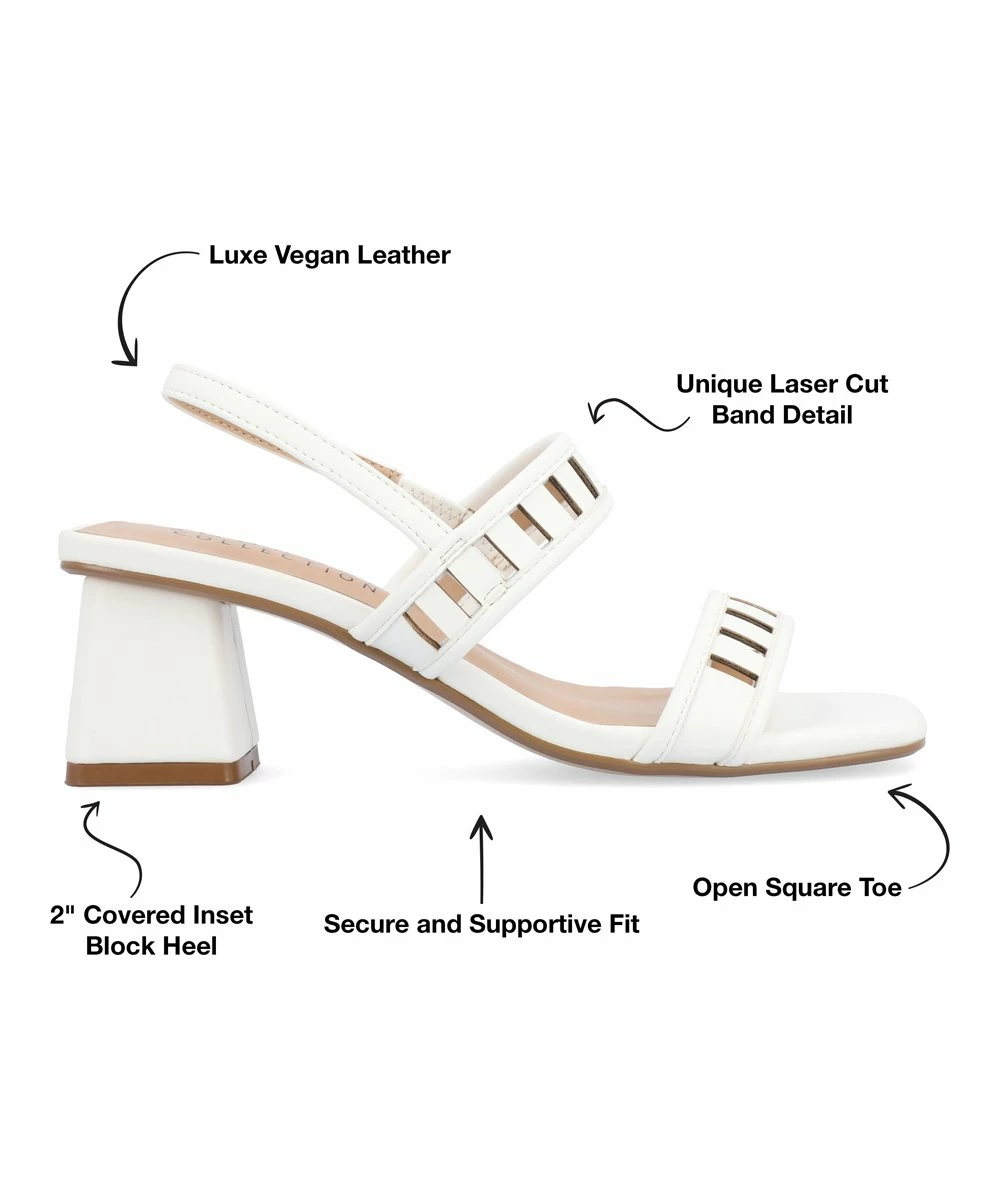 This block-heeled sandal features a slingback strap and a square toe. A laser-cut design enlivens the upper straps.