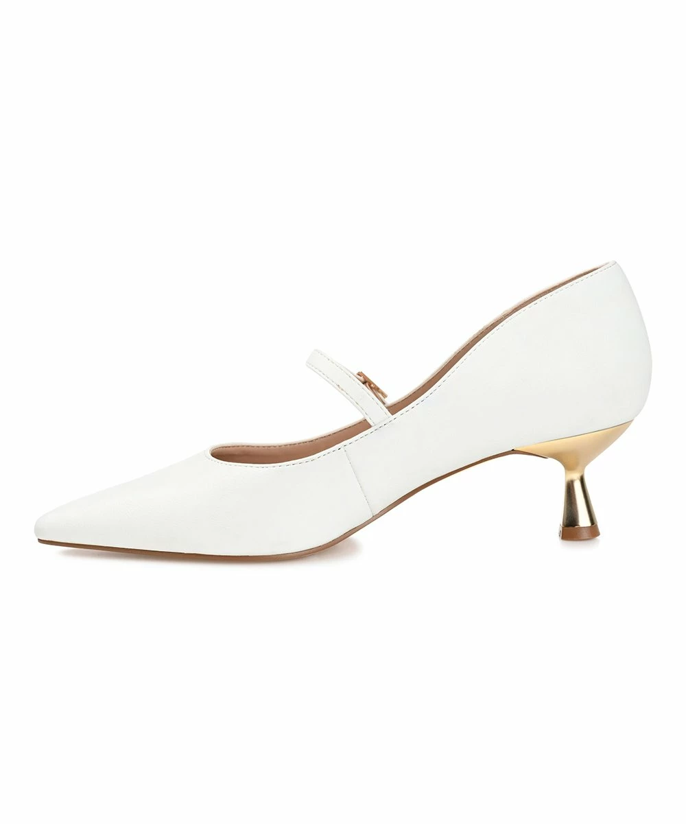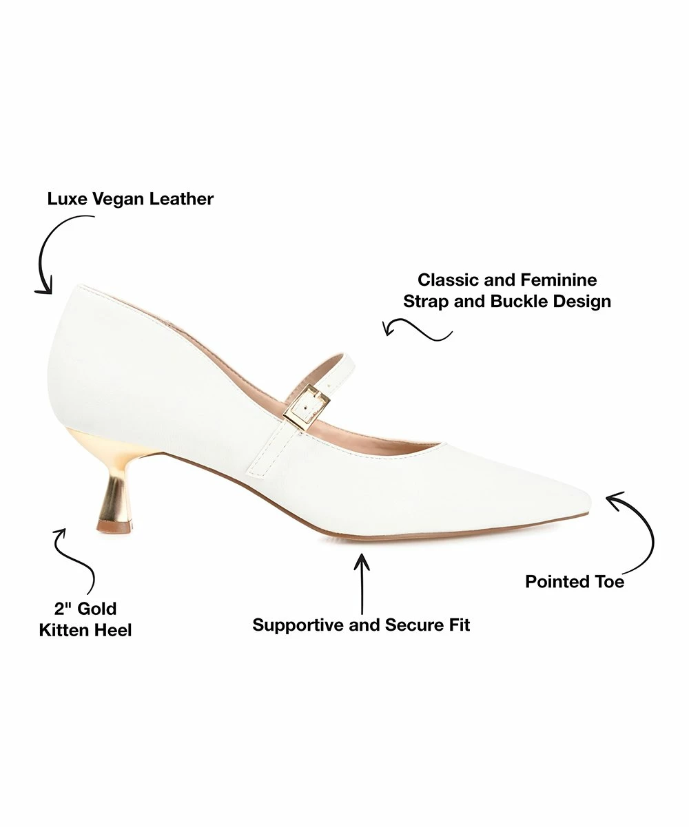 This pointed-toe pump features a chic kitten heel and a stylish buckle-strap design.